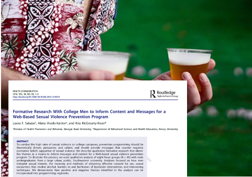 Formative Research With College Men to Inform Content and Messages for a Web-Based Sexual Violence Prevention Program, Health Communication, 32:9, 1133-1141, DOI: 10.1080/10410236.2016.1214219